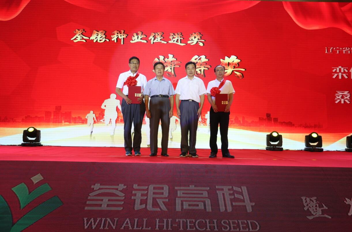 (中國種子協(xié)會副會長兼秘書長蔣協(xié)新與安徽張海銀種業(yè)基金會理事長張海銀為“荃銀種業(yè)促進(jìn)獎(jiǎng)”特等獎(jiǎng)獲得者鐵嶺市農(nóng)科院欒化泉研究員、桑立君研究員頒獎(jiǎng))